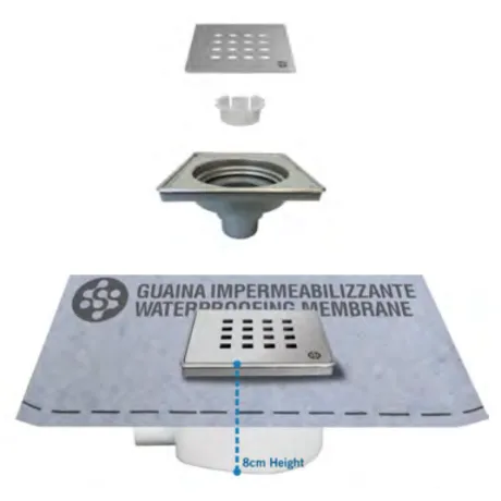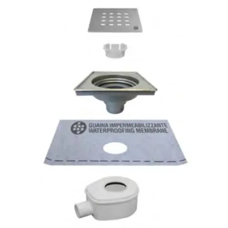 ΚΙΤ - σχάρα - βάση, σύστηµα σιφωνιού µε έξοδο Φ40 και υγροµονωτική µεµβράνη 1m2 (προσαρµοσµένη στο σιφώνι).Συνολικό ύψος εγκατάστασης 8 cm.