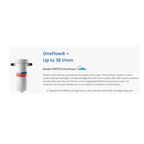 Το σύστημα OneFlow + είναι ένα διπλό σύστημα με δύο φυσίγγια: ένα ακτινικό φυσίγγιο με φίλτρο άνθρακα 20 μικρών που μειώνει τα ιζήματα και τη γεύση και την οσμή του χλωρίου και ένα ενσωματωμένο OneFlow που αποτρέπει την κλίμακα.