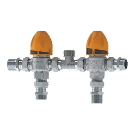 Ηλιακό θερμοστατικό συγκρότημα εκτροπής/ανάμειξης για τη σύνδεση θερμοδοχείου ηλιακού συστήματος με λέβητα, που αποτελείται από θερμοστατική βαλβίδα εκτροπής, θερμοστατική αναμεικτική βαλβίδα και σύνδεσμο Τ για τη σύνδεση με λέβητα, κατασκευασμένο από: Ορείχαλκο CW617N, o-ring στεγανοποίησης: EPDM, χειροκίνητες λαβές: PA, ανοξείδωτα ελατήρια: AISI 302, βαλβίδες αντεπιστροφής: POM, σπειρώματα: ISO 228. Μέγιστη θερμοκρασία προσαγωγής: +100 ° C, μέγιστη πίεση λειτουργίας: 10 bar, μέγιστη διαφορική πίεση: 2 bar, εύρος ρύθμισης θερμοκρασίας βαλβίδας εκτροπής: +30 ÷ +55 ° C, εργοστασιακή ρύθμιση βαλβίδας εκτροπής: +45 ° C, εύρος ρύθμισης θερμοστατικής αναμεικτικής βαλβίδας: +30 ÷ +55 °C, εργοστασιακή ρύθμιση θερμοστατικής αναμεικτικής βαλβίδας: +38 ° C, ακρίβεια: ± 2 ° C, παροχή θερμοστατικής αναμεικτικής βαλβίδας στα 3 bar: 30 l/min, συμβατότητα ρευστού: πόσιμο νερό. Συμμορφώνεται με το UNI EN 1111. Σπειρώματα G 3/4” M.