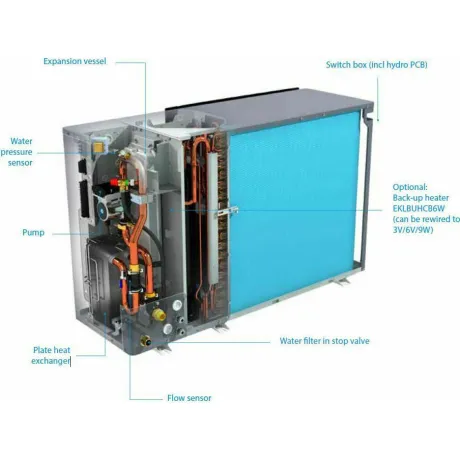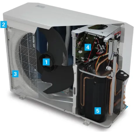 Το σύστημα είναι monoblock, που σημαίνει ότι όλα τα επιμέρους κατασκευαστικά του στοιχεία (όπως για παράδειγμα ο συμπιεστής, ο εναλλάκτης θερμότητας, οι ανεμιστήρες, κλπ), είναι ενσωματωμένα μέσα σε μια μονάδα, η οποία τοποθετείται σε εξωτερικό χώρο. Αυτό σας προσφέρει ευκολία εγκατάστασης και απευθείας σύνδεση με το σύστημα νερού.