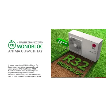 Η πρώτη στον κόσμο R32 Monobloc αντλία θερμότητας προσφέρει παραγωγή ζεστού νερού χρήσης 65ο C. Η LG Therma V R32 Monobloc διαθέτει 100 συμβατότητα με σώματα καλοριφέρ και ενδοδαπέδια θέρμανση, ενώ είναι δυνατή η χρηματοδότηση από το πρόγραμμα «Εξοικονόμηση κατ'οίκον ΙΙ.