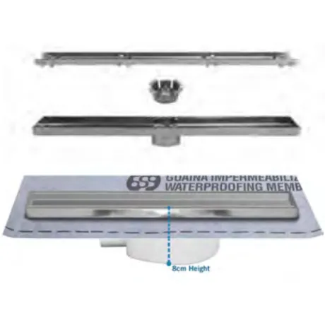 ΚΙΤ - κανάλι, σχάρα, σύστηµα σιφωνιού µε έξοδο Φ40 και υγροµονωτική µεµβράνη 1m2 (προσαρµοσµένη στο σιφώνι).Συνολικό ύψος εγκατάστασης 8 cm.